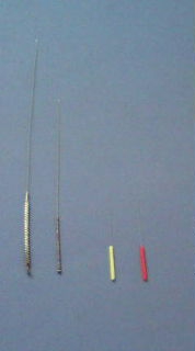 左二本が中国の鍼。右二本が当鍼灸(はりきゅう)院で使用している日本の鍼です。長さも太さもこれだけ違いがあります。