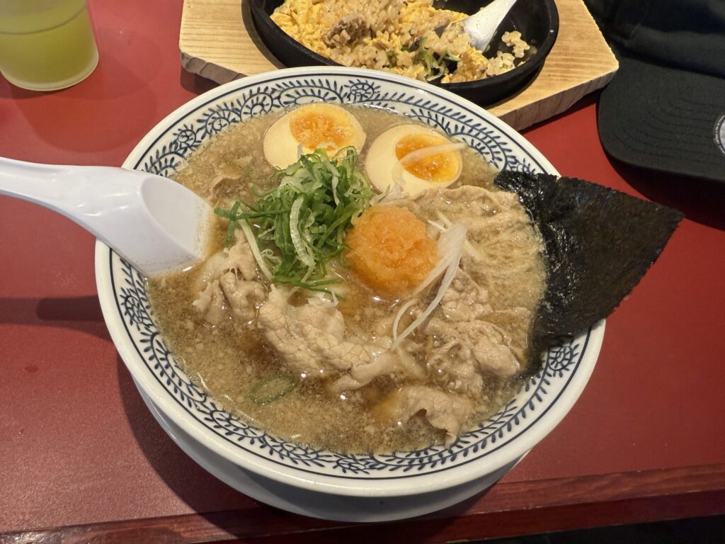 丸源ラーメン定番の「味玉肉そば」です↑